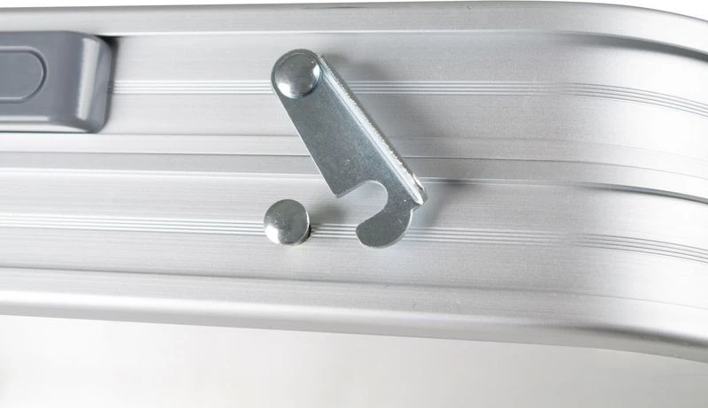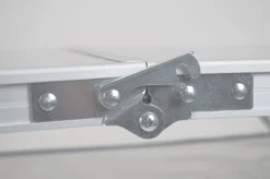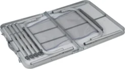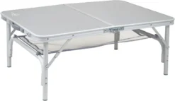 Deze campingtafel is compact mee te nemen dankzij de opvouwbare poten en het inklapbare tafelblad. Je vouwt het blad eenvoudig dubbel waardoor deze tafel zich opvouwt tot een handige koffer. Het tafelblad is daarbij water- en hittebestendig. Geknoeid? Geen probleem! Het frame en het tafelblad zijn gemaakt van lichtgewicht aluminium, waardoor de gehele tafel 5,5 kg weegt.